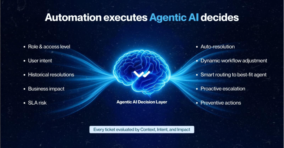 Agentic AI introduces an autonomous decision to layer into the helpdesk. Instead of waiting for predefined triggers, the system evaluates each request holistically. It considers who raised it, what they need, why they need it, which systems are involved, and how similar issues were resolved in the past.