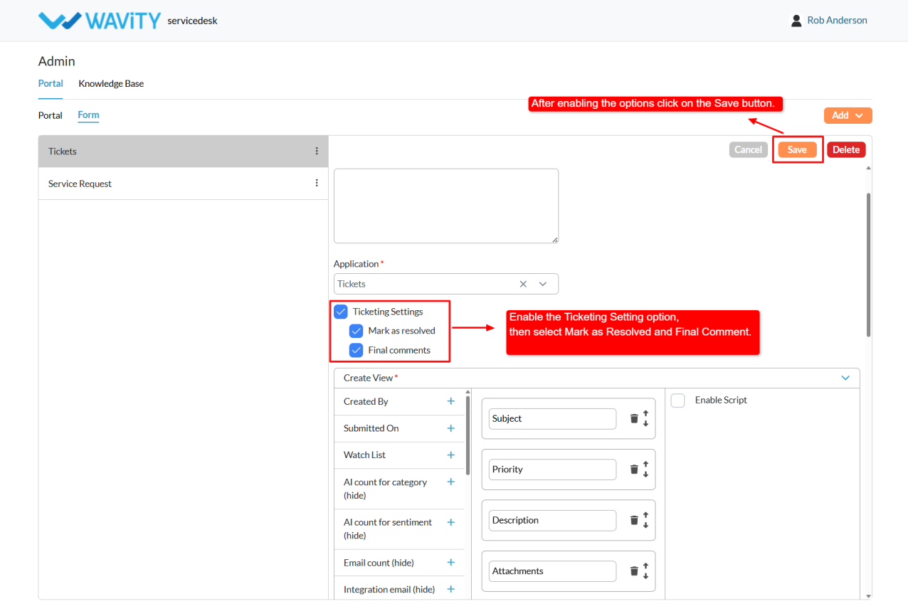 - Enable the Ticketing Settings option and Mark as Resolved option and Final Comment option (if required)