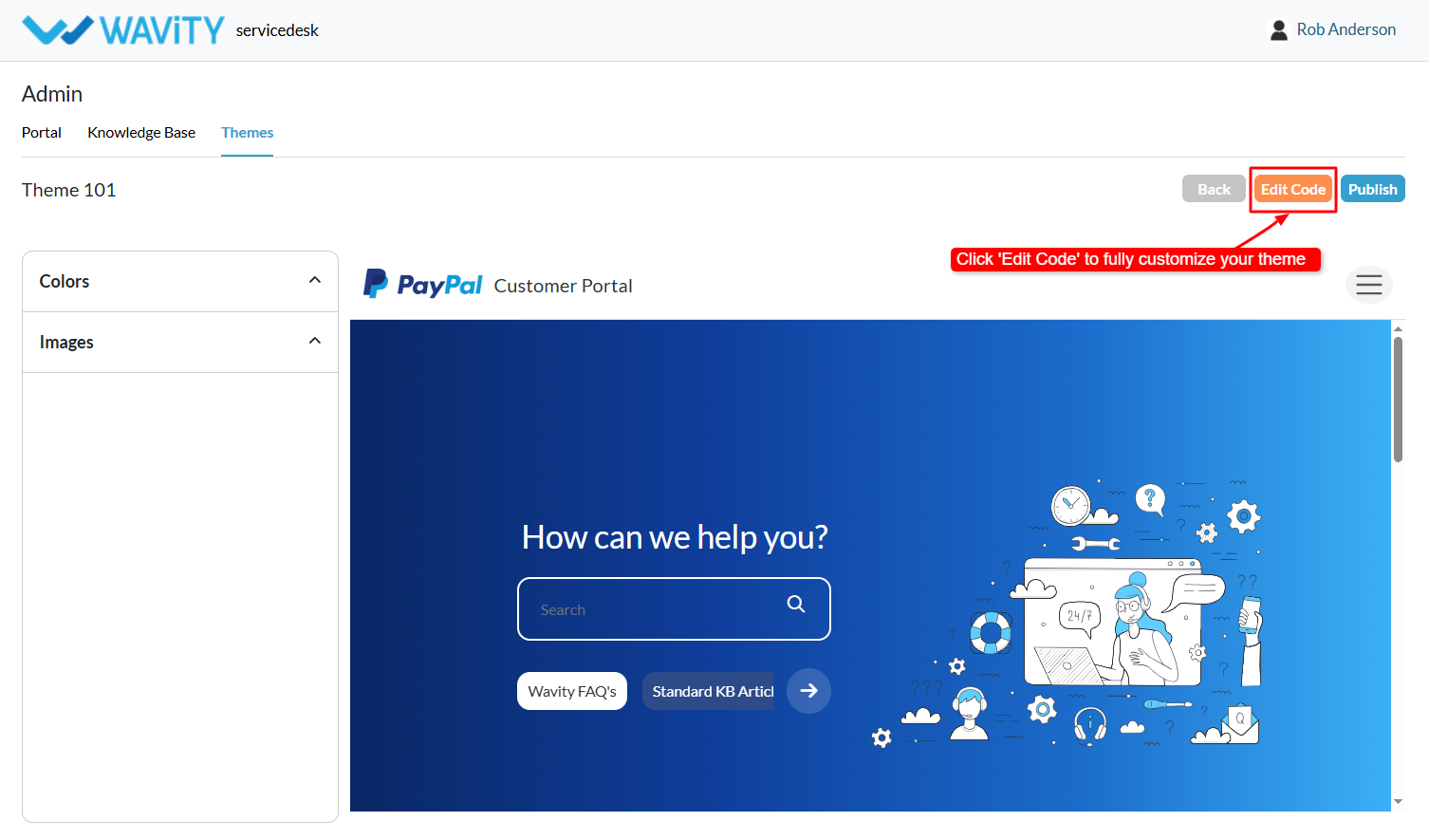 - Wavity allows administrators to create and fully customize themes in the Customer Self-Service Portal to match their organization’s branding and design requirements.