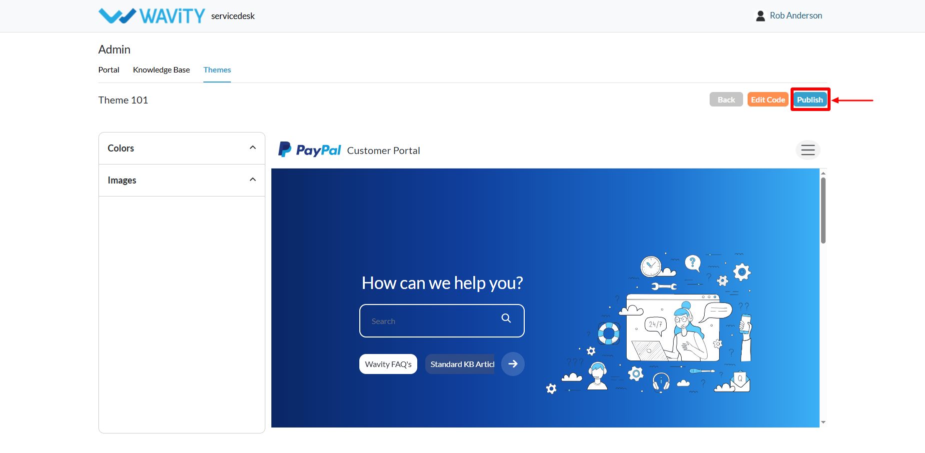 - Once all changes are complete: Click Publish. The new theme will be applied to the Customer Self-Service Portal.