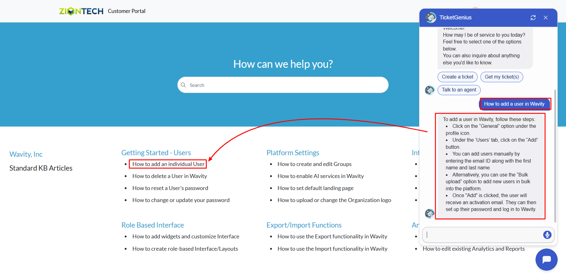 - The chatbot will respond to your query. If your admin has enabled knowledge base syncing, it will check for relevant articles and provide a summarized answer for quick reference.